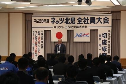 ネッツトヨタ北見(栗山太郎社長)はこのほど、市内のホテルで「平成29年度全社員大会」を開催し、各種目標を全社員に伝えた。新年度のスローガンは「切磋琢磨」。新車販売は1千台、中古車販売は700台を目指す。 冒頭、河合昭徳会長が「経営計画をよ...