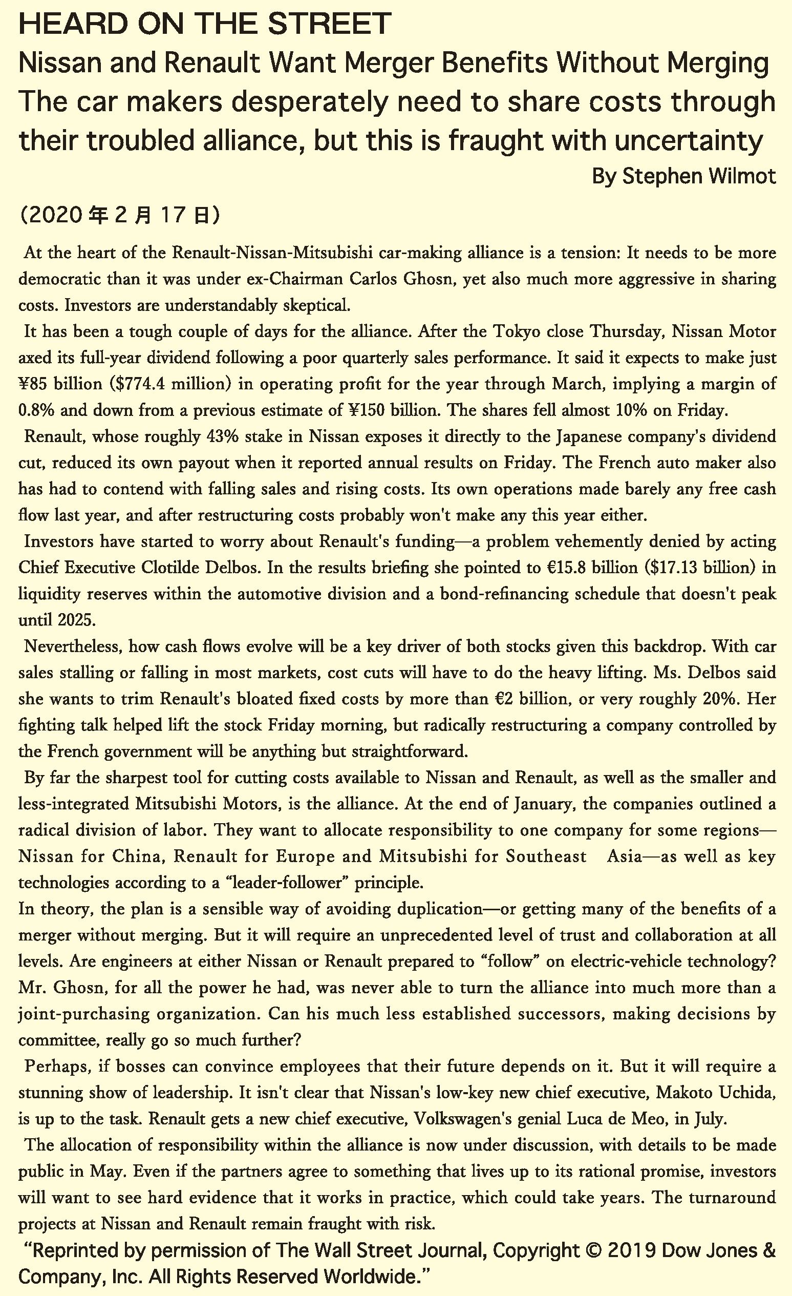 〈ウォールストリートジャーナルの記事から〉 日産・ルノー、合併せずに「合併効果」を期待