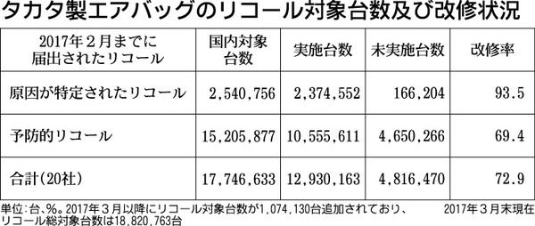 国土交通省は19日、タカタ製エアバッグ用インフレーター(膨張装置)のリコール(回収・無償修理)進ちょくをまとめた。3月末時点の改修率は72・9%と前月より3ポイント上がった。一方で3月以降に約107万台分の届け出があり、総対象台数は延べ1...