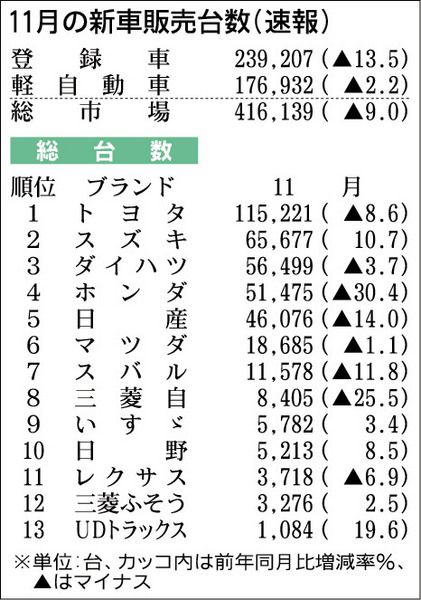 日本自動車販売協会連合会(自販連)と全国軽自動車協会連合会(全軽自協)が1日発表した2014年11月の新車販売台数は、前年同月比9・0%減の41万6139台となり、5カ月連続で減少した。消費増税前の駆け込み需要などにより前年の11月が高水...