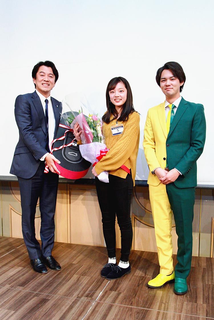 静岡県を中心に輸入車販売を展開するエー・エル・シー(森田邦裕社長)が一般公募した同社のイメージキャラクター「若葉ちゃん」のグランプリに、御殿場市出身の大学1年生の阪本楽衣さんが選ばれた=写真中央。阪本さんは今後、同社のテレビCMやインスタ...