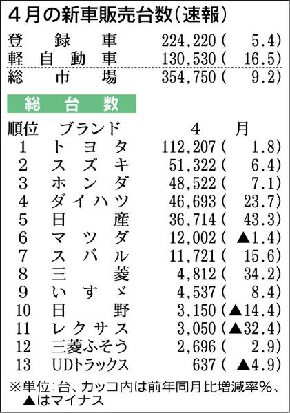 4月の新車販売(登録車、軽自動車合計)は、前年同月比9・2%増の35万4750台となり、6カ月連続のプラスだった。登録車は同5・4%増の22万4220台で9カ月連続でプラス。軽自動車は同16・5%増の13万530台となり、4カ月ぶりのプラ...