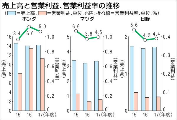 メーカーの2017年3月期決算の発表が始まった。28日までに発表を終えたホンダ、マツダ、日野自動車はホンダが減収増益、マツダと日野が減収減益だった。前年度に比べ対ドルで12円もの円高だったことが、売上高と利益に大きく影響した。18年3月期...