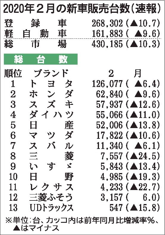 2月の登録車と軽自動車を合わせた新車販売台数は、前年同月比10.3%減の43万185台となり5カ月連続のマイナスだった。消費税増税や自然災害などによる消費マインドの落ち込みが引き続いたものとみられる。しかし、2月中旬以降、新型コロナウイルスへの懸念から一部でディーラー店頭への来場に影響が出ているとの声もある。今後、足元の受注活動にも響いていけば、3月以降の登録・届け出台数への影響が懸念される。
