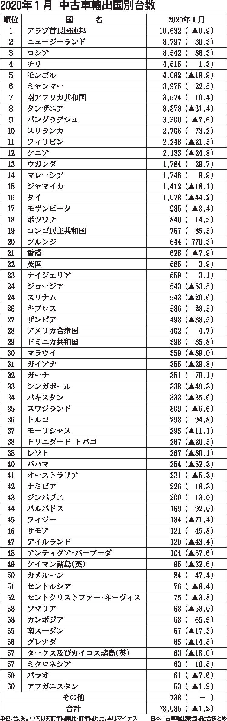 日本中古車輸出業協同組合(佐藤博理事長)がまとめた2020年1月の中古車輸出台数は、前年同月比1・2%減の7万8085台で2カ月連続のマイナスだった。右肩上がりが続いていたアラブ首長国連邦(UAE)が20カ月ぶりのマイナス。国内の中古車流...