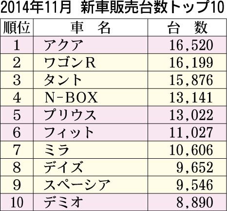 日本自動車販売協会連合会(自販連)と全国軽自動車協会連合会(全軽自協)は4日、2014年11月の車名別新車販売ランキングを発表した。総合順位では1万6520台を販売したトヨタ自動車「アクア」が2カ月連続のトップとなった。2位には軽自動車ト...