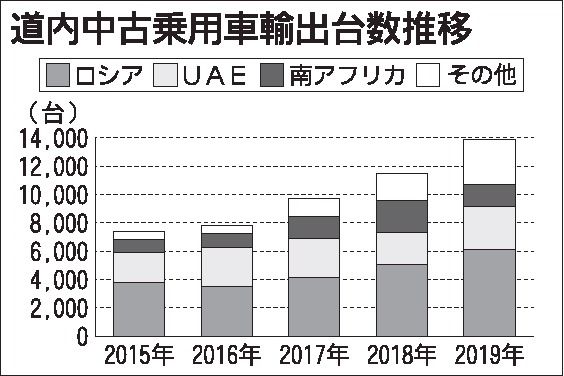 2019年の道内中古乗用車輸出台数(速報値)は、前年比21・1%増の1万3872台で、2年連続して1万台を上回った。ロシアやアラブ首長国連邦(UAE)向けなどが好調に推移した。輸出総額は19・1%増の約48億6100万円だった。 函館税関...