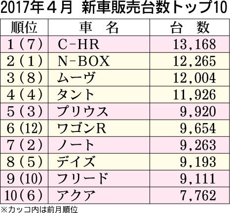 4月の車名別順位(登録車、軽自動車合計)は、トヨタ「C―HR」が初の首位を獲得した。2016年12月の発売以後、4カ月目でトップに立った。国内市場で人気のSUVであることに加え、ハイブリッド車(HV)の設定や、トヨタディーラーの全系列店で...