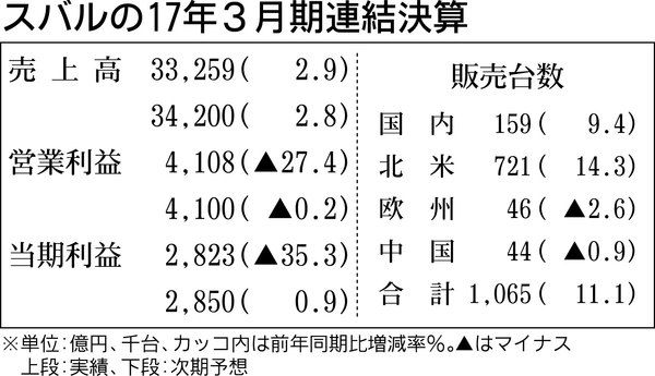 スバルは9日、2018年3月期の営業利益が2期連続で減少すると発表した。販売台数の増加や円安を見込むものの、販売車種構成の変化による収益性の低下や米国の金利上昇に伴う販売管理費の増加、試験研究費の増加などが減益要因になる。 販売台数と売上...