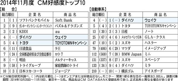 CM総合研究所(関根心太郎代表)がまとめた11月度のCM好感度ランキング。総合1位はソフトバンクモバイルの「ソフトバンク」が守ったが、2位にはガンホー・オンライン・エンターテイメントの「パズル&ドラゴンズ」が食い込んだ。自動車関連ではダイ...