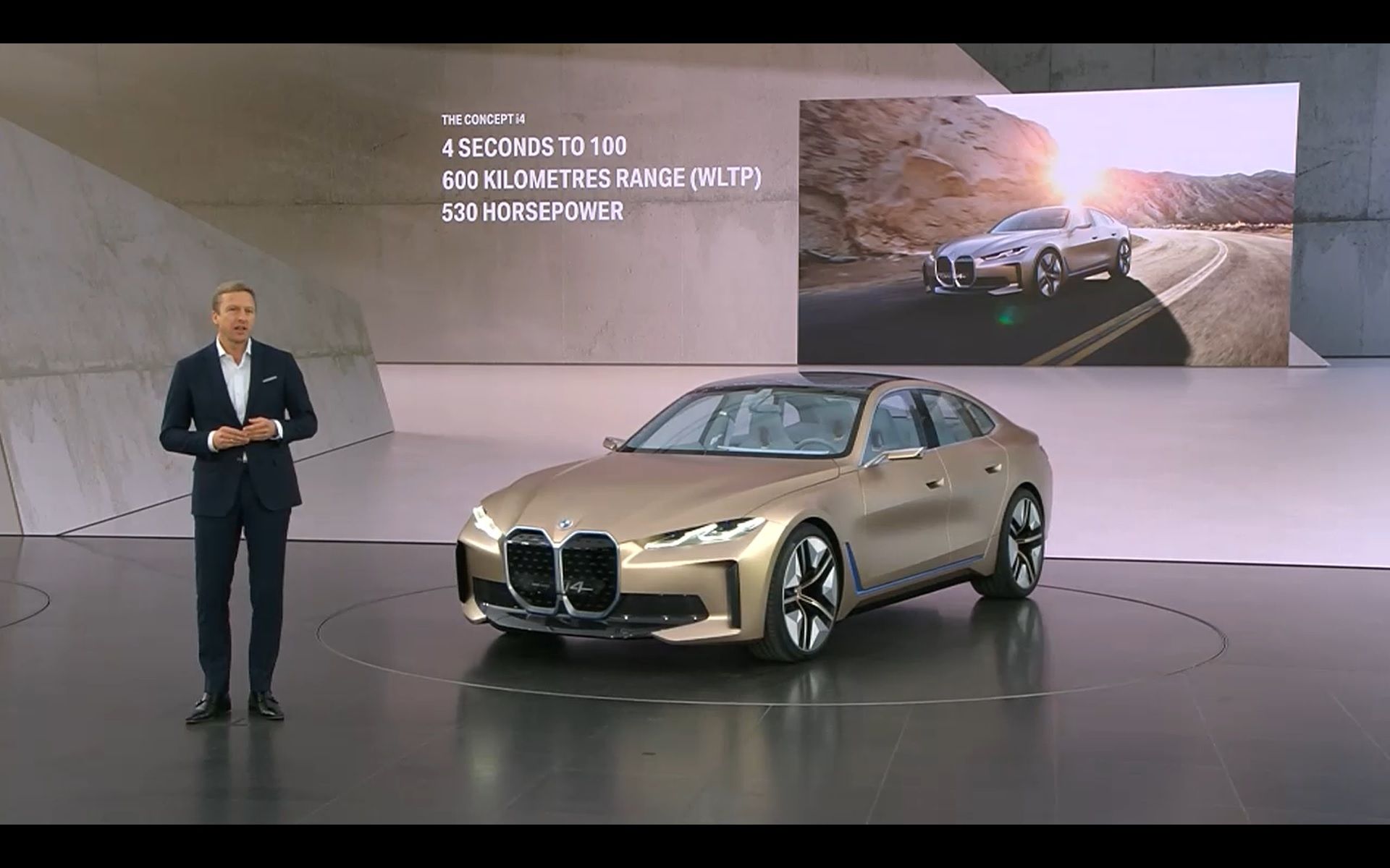 BMWは、EVの新型4ドアクーペのコンセプトモデル「BMW コンセプトi4」を世界初披露した。エネルギー密度の高い小型バッテリーを採用し、最大航続距離600キロメートルを確保するとともに、最高出力530馬力のパワートレーンにはレアアース(希少金属)を使用しないモーターを採用し、部品単位で環境にも配慮した。独ミュンヘンの工場で生産し、2021年の市販化を予定する。