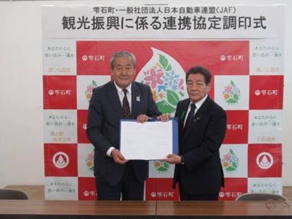 【雫石・大船渡】日本自動車連盟(JAF)岩手支部(高橋康雄支部長)は岩手県雫石町(深谷政光町長)と同県大船渡市(戸田公明市長)と「観光振興に係る連携協定」をそれぞれ締結し、相次いで「調印式」を実施した。4月26日には雫石町役場大会議室、5...
