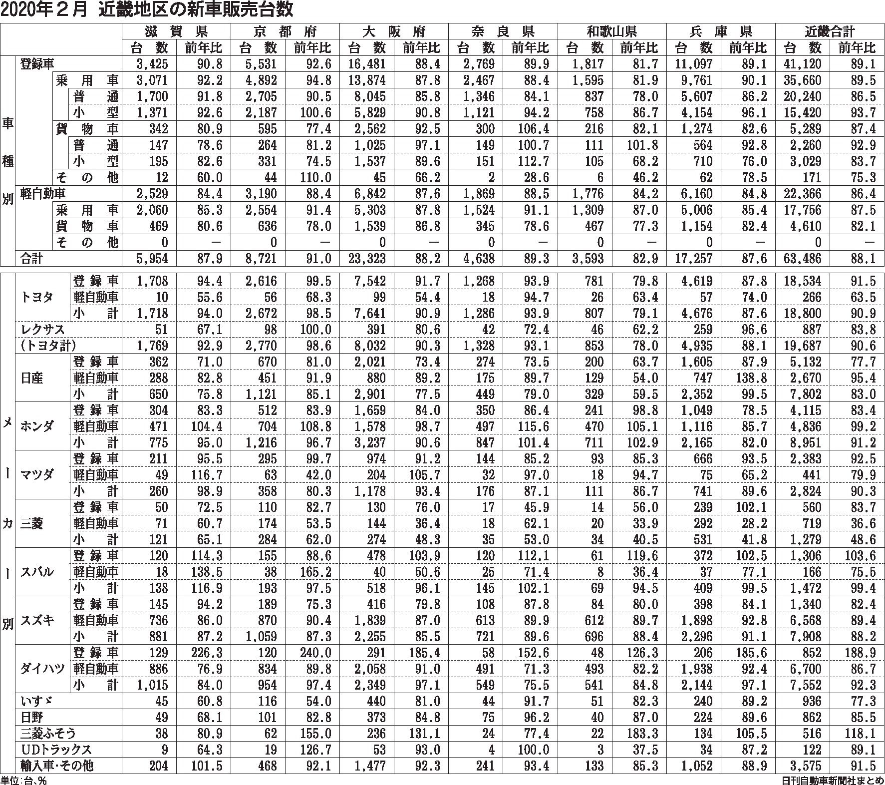 近畿2府4県の2020年2月の新車販売台数は登録車と軽自動車の合計が5カ月連続のマイナスとなる前年同月比11・9%減の6万3486台だった。年度末商戦にも差し掛かり、新型車の投入も相次いだが、需要の落ち込みが続く。2月に入って感染が拡大し...