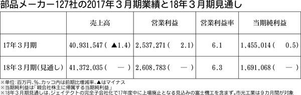 日刊自動車新聞がまとめた部品メーカー127社合計の2017年3月期決算は、売上高が前期比1・4%減の40兆9315億円、営業利益が同2・1%増の2兆5372億円と減収増益となった。円高による為替換算の影響などで売上高が目減りして42社が減...