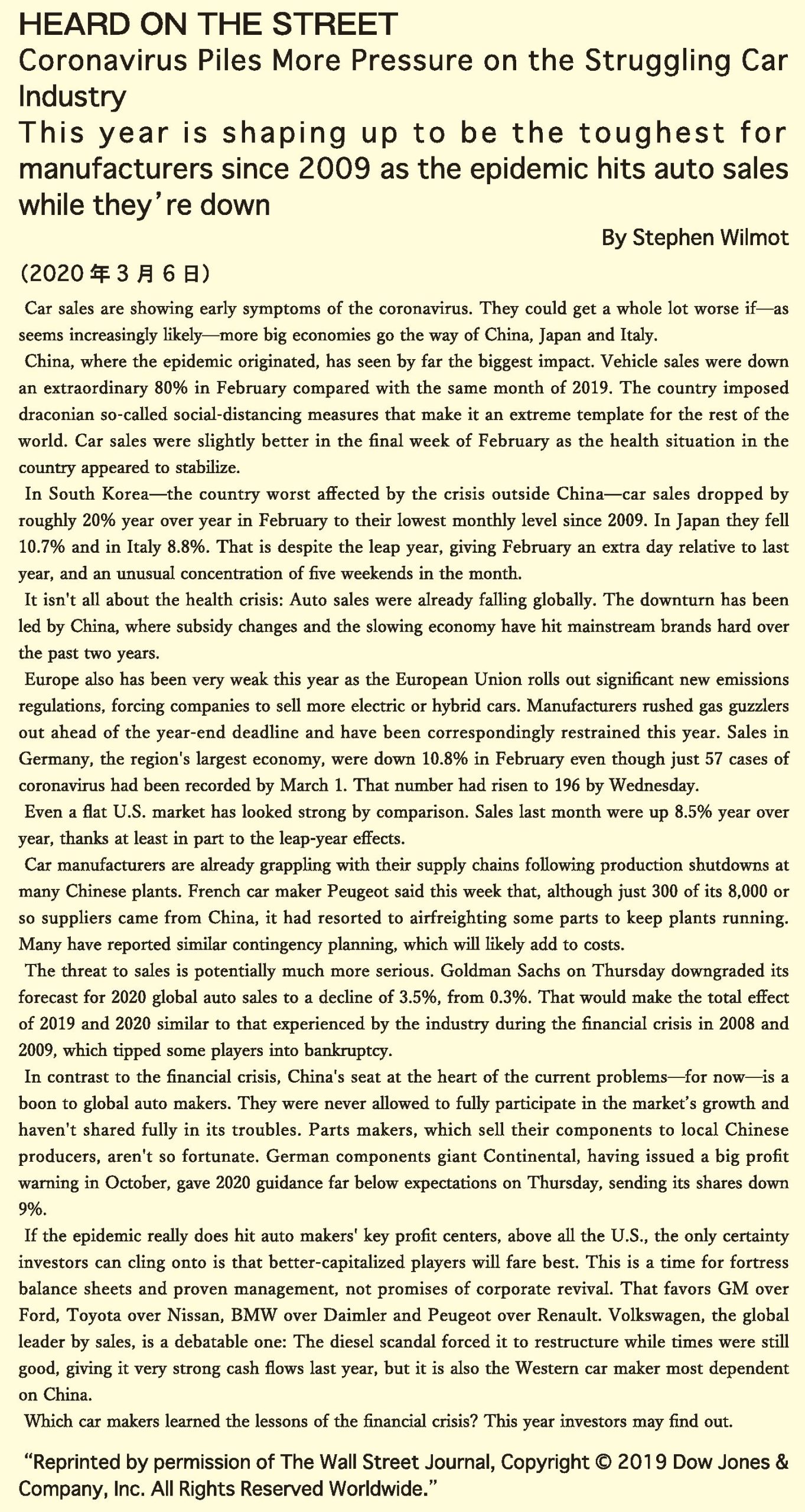 By Stephen Wilmot2020 年 3 月 6 日 ――WSJの人気コラム「ハード・オン・ザ・ストリート」*** 自動車販売に新型コロナウイルス感染の初期症状が出ている。多くの主要国が中国や日本・イタリアと同じ道をたどれば――そ...