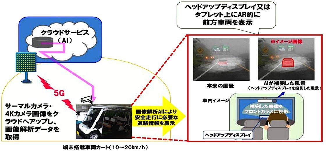 モビリティ分野では、オートバックスセブン、大分交通が協力し、大分市で「5Gを活用した濃霧の中での運転補助に関する実証実験」を実施した。赤外線を使って熱を可視化できるサーマルカメラと画像認識を活用し、高速・大容量・低遅延が特徴の5Gを使って、視界不明瞭な濃霧の中でドライバーが車線や前方の車両を認識するのを支援するシステムについて実現性の検証を日本で初めて実施した。実験では、走行車両が人工知能(AI)で解析した検知結果によって目視では確認困難な障害物などの情報を補助情報としてドライバーに通知し、安全な走行につながることを確認したという。