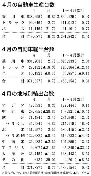 日本自動車工業会(西川廣人会長)が31日にまとめた4月の四輪車生産台数は、前年同月比16・3%増の74万9087台だった。前年実績を上回るのは6カ月連続となる。新型車の投入や販売が好調に推移していることが寄与した。昨年4月は熊本地震の影響...