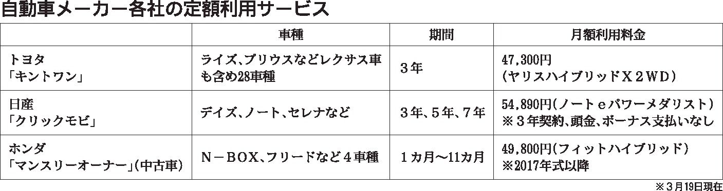 自動車メーカー各社が新車や中古車の定額利用サービスに相次ぎ参入している。トヨタ自動車のサブスクリプション(定額利用)サービス「KINTO(キント)」に続き、日産自動車も個人向けリースの新サービスを本格展開する。ホンダは中古車で1年未満の短...
