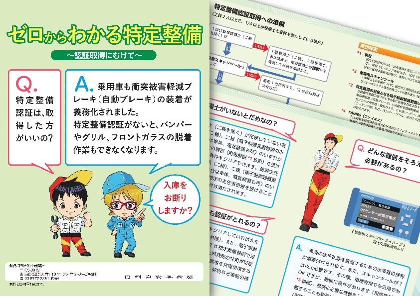 4月1日から新たに特定整備制度がスタートしました。義務化された緊急被害軽減ブレーキをはじめ、高度化する安全支援システムをしっかり整備するためには電子制御装置整備認証の取得が必要になります。認証を取得するために必要なもの、車載技術の高度化に対応するために準備すべきこと、いろいろあるため困惑している整備事業者らの声を聞きます。そこで、まずは電子制御装置整備認証を取得し特定整備事業者となるために必要な要件について絞り込んだ解説書「ゼロからわかる特定整備~認証取得にむけて」を刊行しました。特定整備導入編のテキストとして、または各種資料の補助資料としてご活用いただけます。