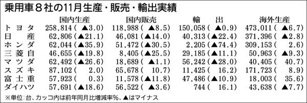 乗用車メーカー8社が24日発表した2014年11月の生産・輸出・販売実績によると8社合計の世界生産台数は前年同月比5・2%減の217万3819台となり、2カ月連続で前年同月実績を割り込んだ。消費増税前の駆け込み需要の反動減で国内生産が不振...