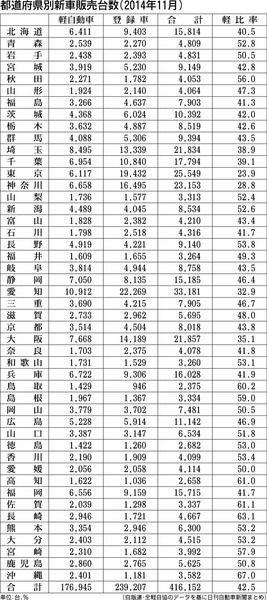 日刊自動車新聞がまとめた2014年11月の都道府県別新車販売台数および軽自動車比率によると、軽比率が最も高かったのは沖縄で67・0%だった。さらに長崎、佐賀、高知、鳥取でも60%を超えた。 11月の全国市場は前年同月比9・0%減。47都道...