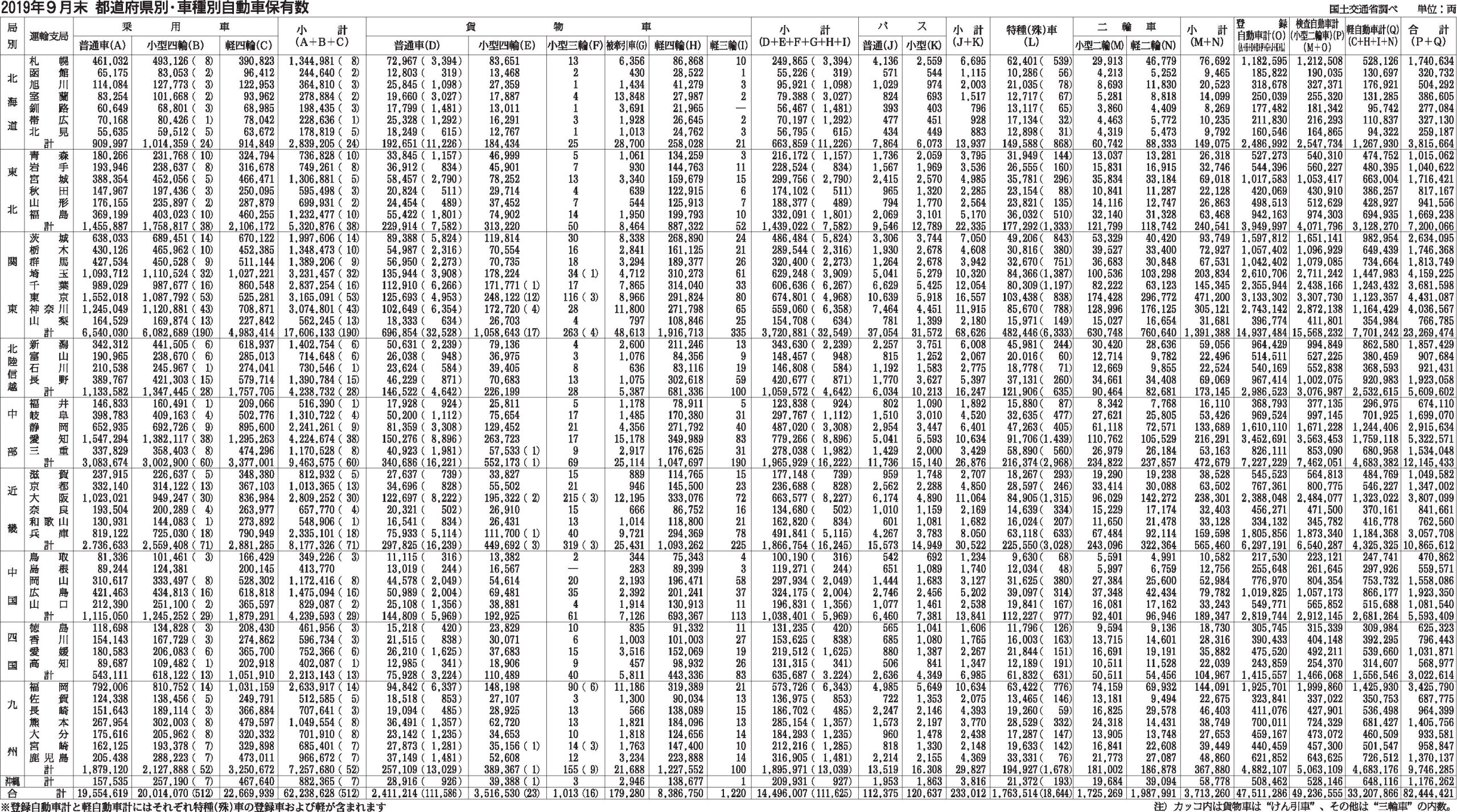 〈2019年9月末 都道府県別・車種別自動車保有数〉