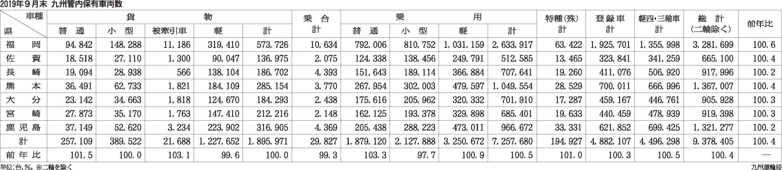 〈2019年9月末 九州管区内保有車両数〉