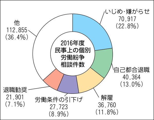 国の総合労働相談窓口に寄せられた2016年度の相談件数が9年連続で100万件を超え、労働紛争や助言・指導を行った相談では「いじめ・嫌がらせ」がトップだったことが厚生労働省のまとめでわかった。 全国の労働基準監督署や都道府県労働局など380...
