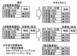 車体課税の見直し案が決まった。エコカー減税の基準は4月から厳しくなるが、新車販売にも配慮し、旧基準の一部車種も減税を継続するほか、軽自動車税に「グリーン化特例」が創設された。基準切り替えに伴う増税分、約1400億円の半分をこれらの減税措置...