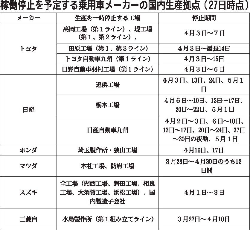 新型コロナウイルスの感染拡大による影響が自動車メーカー各社の国内生産にも影を落とし始めた。27日までにスバル、ダイハツ工業を除く乗用車6社が生産を一時停止することを決めた。自動車需要の縮小に合わせた生産調整に加え、世界的な感染拡大により、...