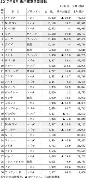 5月の乗用車車名別順位は、ベスト10に軽自動車が6車種ランクインした。軽トップ、全体で2位のホンダ「N―BOX」は前年同月比14・2%増と堅調だった。またダイハツ「ミラ」「ムーヴ」がともに前年同月比で倍増となっている。また新型となったスズ...