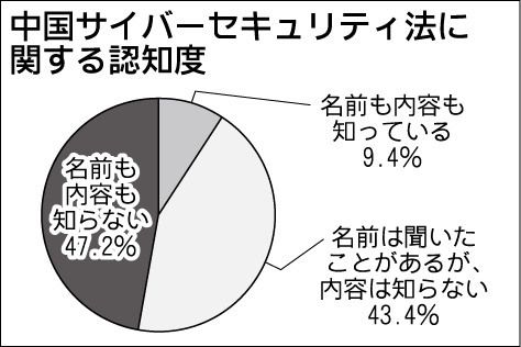 デロイト トーマツ リスクサービス(丸山満彦社長、東京都千代田区)が中国政府が6月から施行したサイバーセキュリティ法について緊急調査したところ、日本企業の9割超が「内容を知らない」と回答したことが分かった。中国サイバーセキュリティ法は通信...