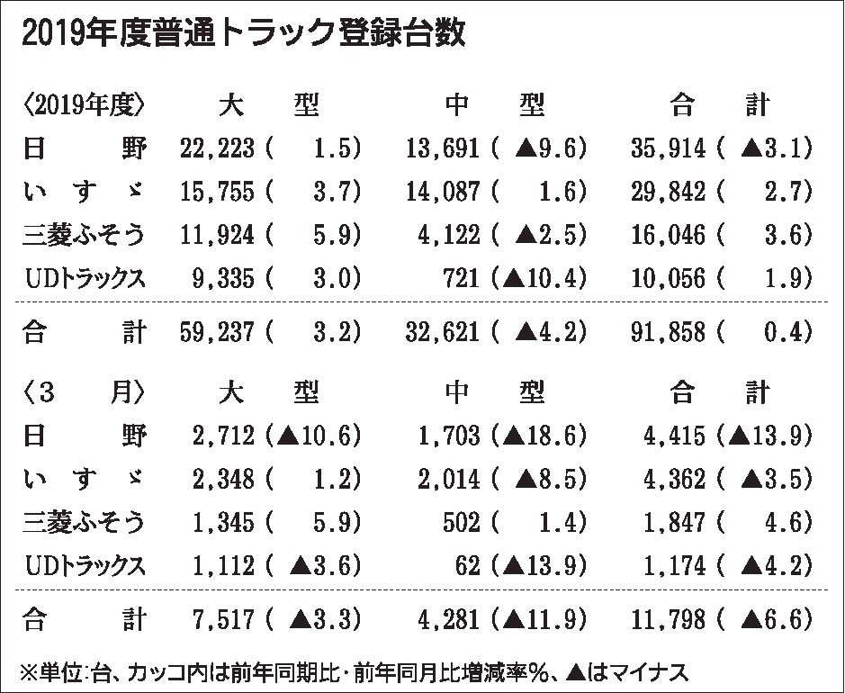 業界筋がまとめた普通トラック(積載4㌧クラス以上)の2019年度新車販売台数は、前年度比0・4%増の9万1858台と2年連続で前年を上回った。シェア1位の日野自動車がマイナスに転じたものの、他の3社は前年実績超えとなった。国内需要が消費税...