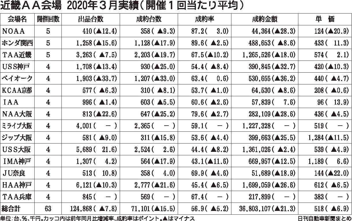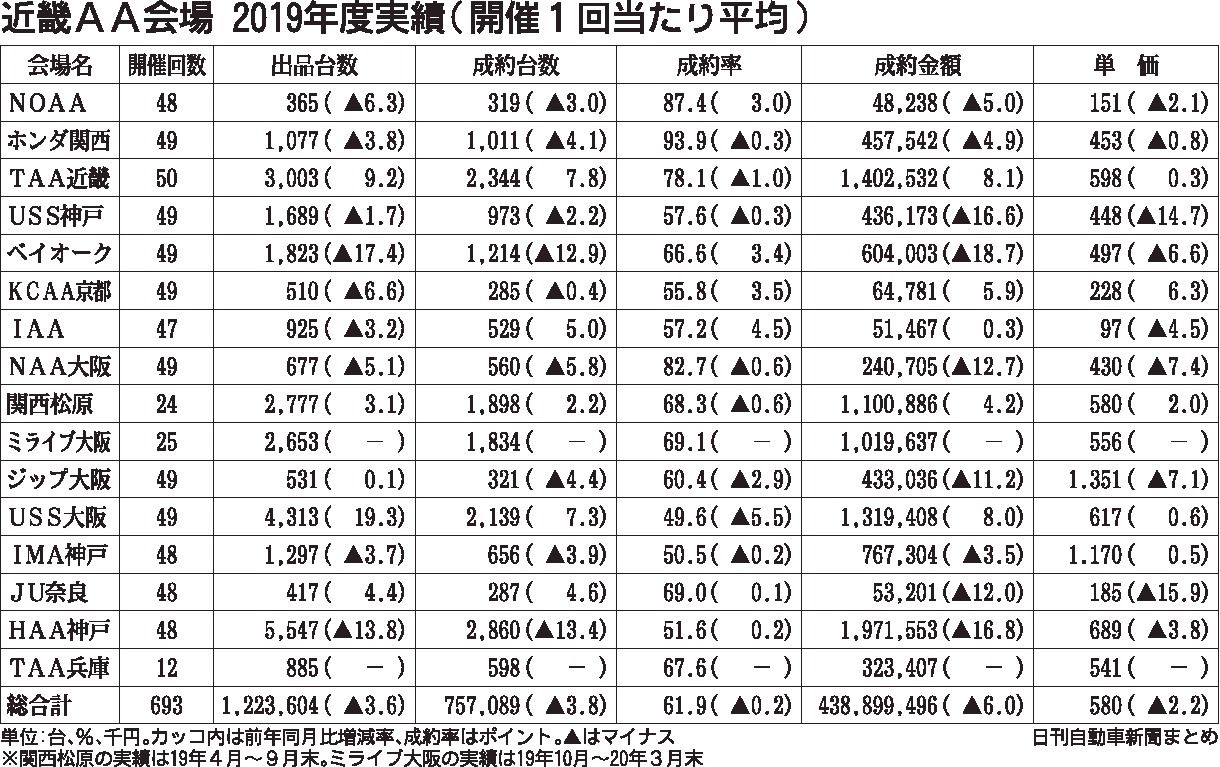 日刊自動車新聞は近畿地区の中古車オークション(AA)15会場の2019年度(4月~20年3月)実績をまとめた。15会場合計の開催回数は前年度に比べ6回少ない693回。出品台数と成約台数、成約率、成約金額、単価のいずれも前年度を下回った。消...
