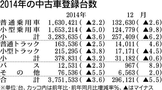 日本自動車販売協会連合会(自販連)が15日発表した2014年(1~12月)の中古車登録台数(新規・移転・変更手続きの合算値)は、前年比3・6%減の375万1533台で、2年連続の前年割れとなった。また、1978年の統計開始以来過去最低の台...
