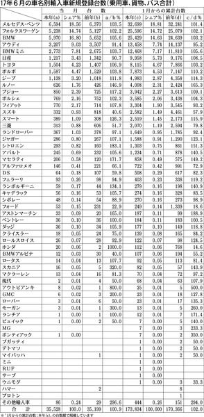 17年6月の車名別輸入車新規登録台数はメルセデス・ベンツが前年同月比3・5%増の6594台で首位。次いでフォルクスワーゲン、BMWとなっている。プラス基調が目立つ上位の中では4位のアウディが同8・6%減にとどまっている。...