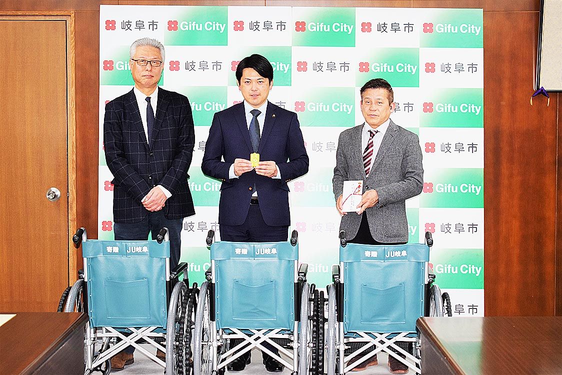JU岐阜、市に車いす寄贈 新1年生に防犯ブザーも