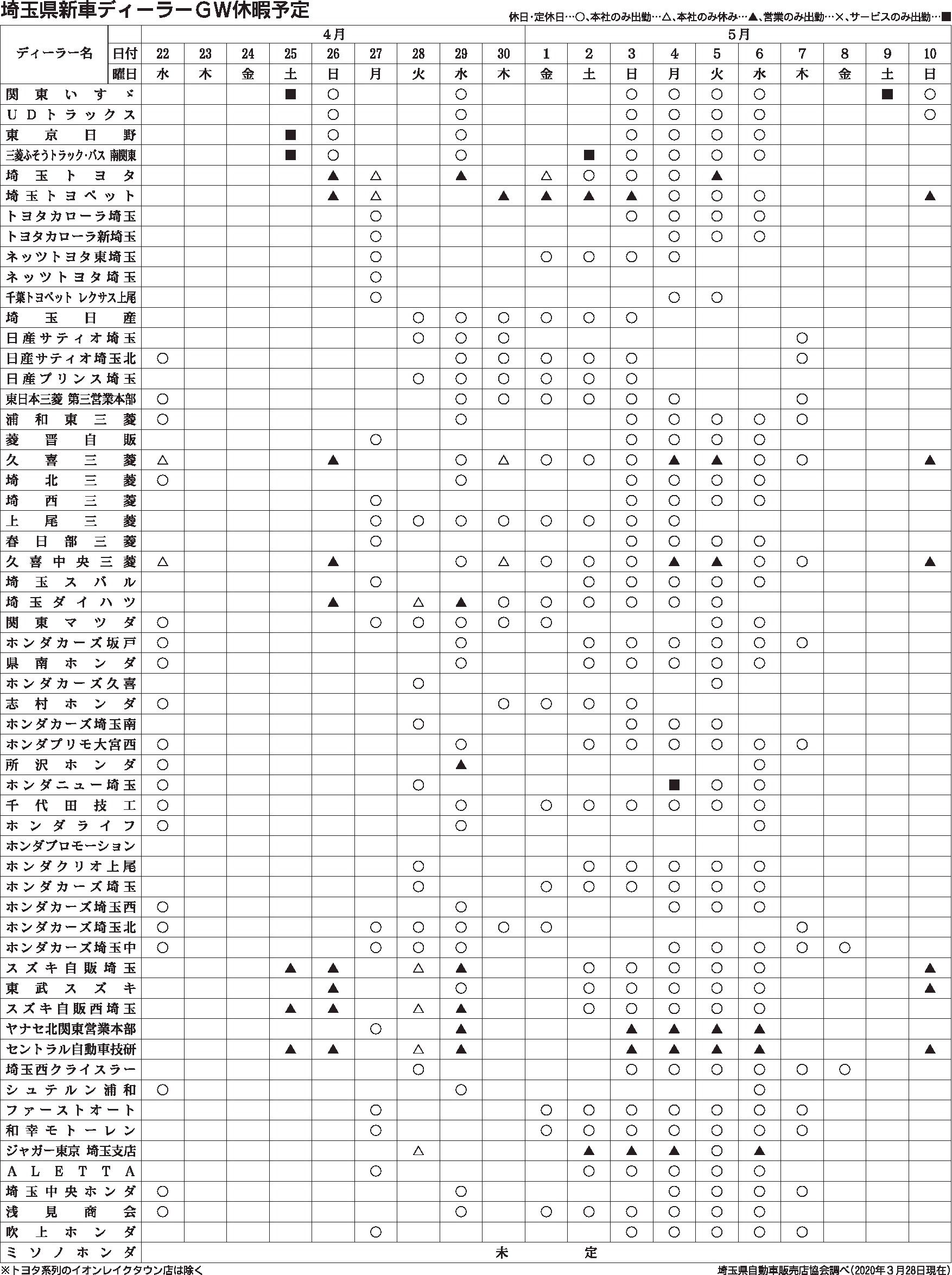 〈埼玉県新車ディーラーGW休暇予定〉