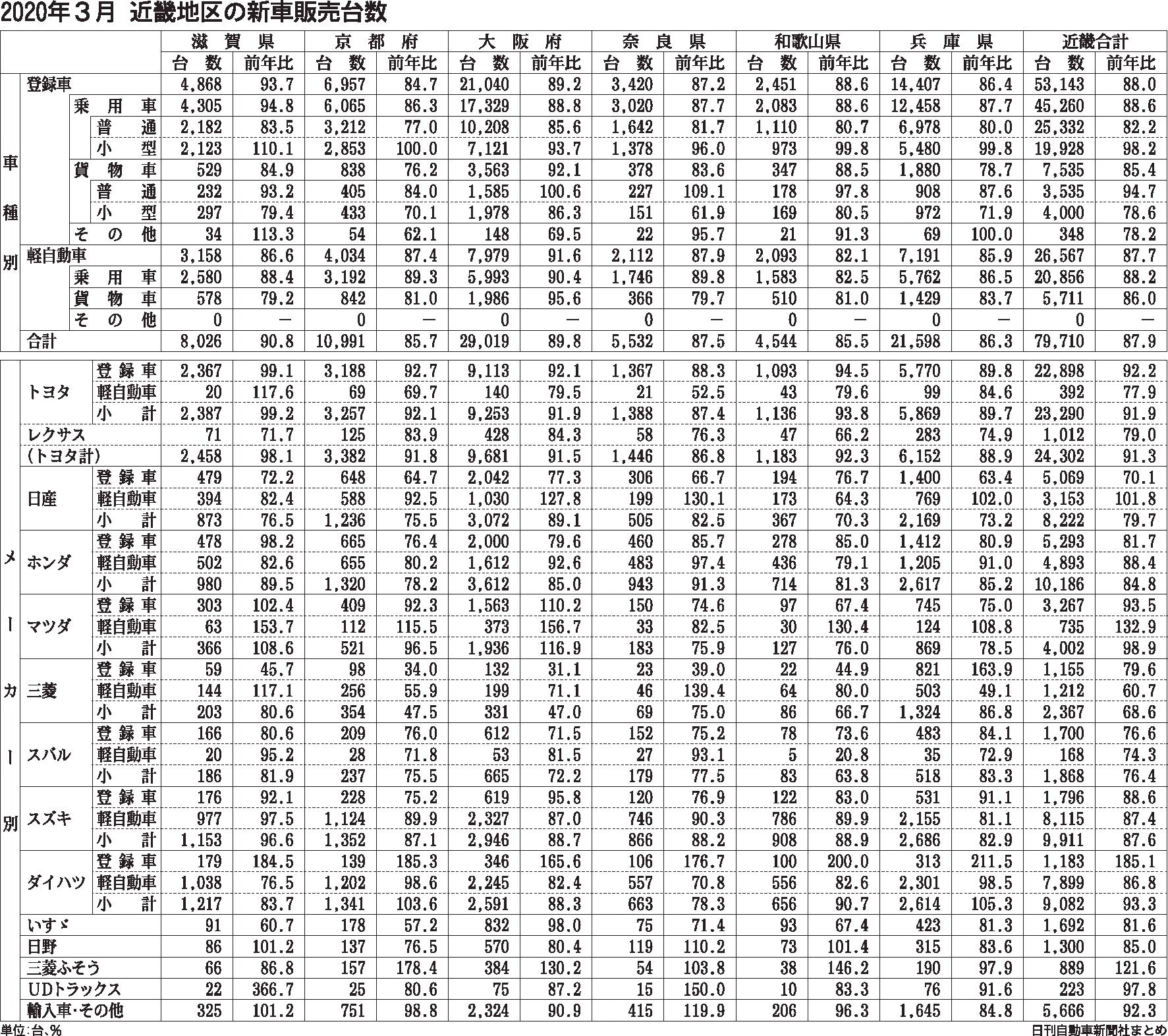 〈2020年3月 近畿地区の新車販売台数〉