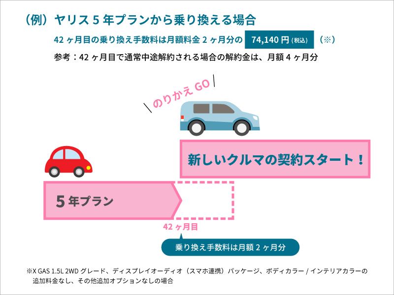 また、契約期間中に別プランに変更できる「のりかえGO」も導入した。3年プランは契約から1年半後、5年および7年プランは3年目以降、半年ごとのタイミングで中途解約よりも少ない手数料で乗り替えできる。乗り替え手数料は月額の1~6カ月分とし、契約期間が経過するほど安くする。例えばヤリス5年プラン(月額3万7070円)で3年目に乗り替えると手数料は3カ月分(11万1210円)、3年半後では2カ月分(7万4140円)などとなる。レクサス車と法人契約車は対象外だ。