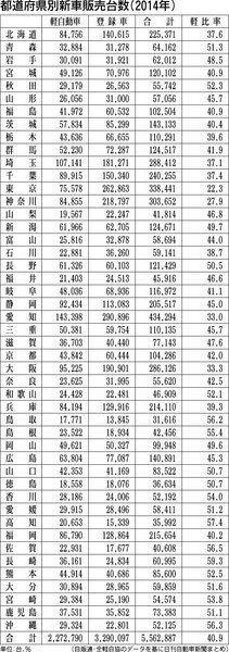 日刊自動車新聞がまとめた2014年の都道府県別新車販売台数および軽自動車比率によると、47都道府県のうち販売台数が減少したのは同1・4%減の山形のみだった。軽比率が最も高かったのは長崎で59・3%だった。さらに18位の長野までが50%を超...