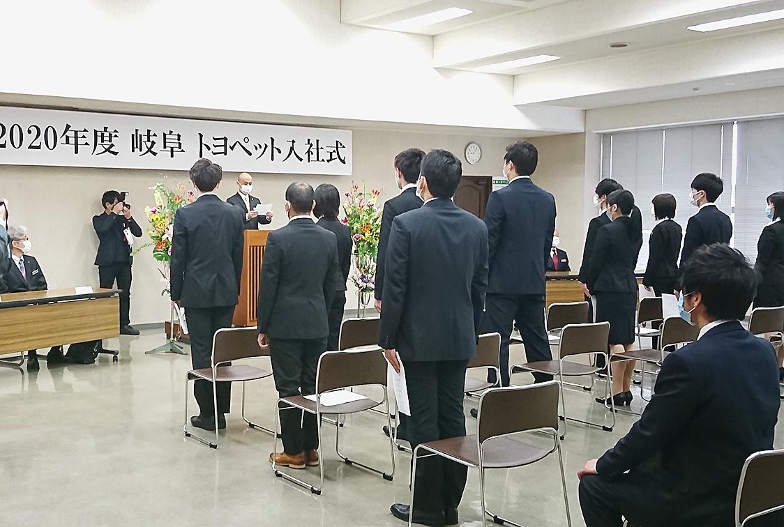【岐阜】岐阜トヨペット(加藤茂樹社長)は1日、羽島郡岐南町の本社サービス棟で入社式を実施した=写真。12人の新入社員と1人の中途採用社員に対し加藤社長が「前向きに社会人生活を送り、自分自身やユーザー、同僚の幸せを目指してほしい」と激励の言...