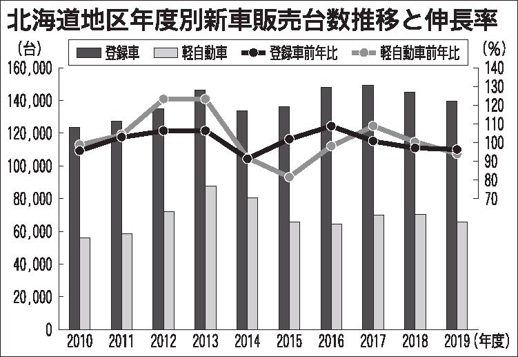 北海道地区の2019年度新車販売台数(登録車と軽自動車の合計)は、昨秋の消費増税などの影響で前年度比4・5%減の20万5486台にとなった。2年連続して前年度実績を割り込んだものの、20万台規模を維持した。うち登録車は3・7%減で、軽が6...