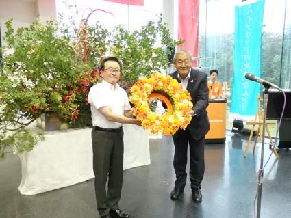 【花巻】トヨタカローラ南岩手(高橋康雄社長)は22日、花巻市の花巻店で「カローラ生誕50周年笑顔の花冠プロジェクト」の「受け渡し式」を開催した。草月流の華道家である丹野霞園氏がカローラ生誕50周年をイメージして制作した生け花の作品の前で、...