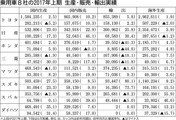 乗用車メーカー8社が28日に発表した2017年上期(1~6月)の生産・販売・輸出実績によると、8社合計の国内生産台数は前年同期比8・4%増の459万8562台となり、3年ぶりに前年同期を上回った。トヨタ自動車、日産自動車、ホンダ、スズキ、...