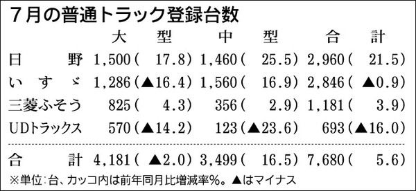 業界筋がまとめた7月の普通トラック(積載量4トン以上)販売は、前年同月比5・6%増の7680台となり、4カ月ぶりに前年実績を上回った。内訳は大型トラックが同2・0%減の4181台、中型トラックが同16・5%増の3499台だった。業界関係者...