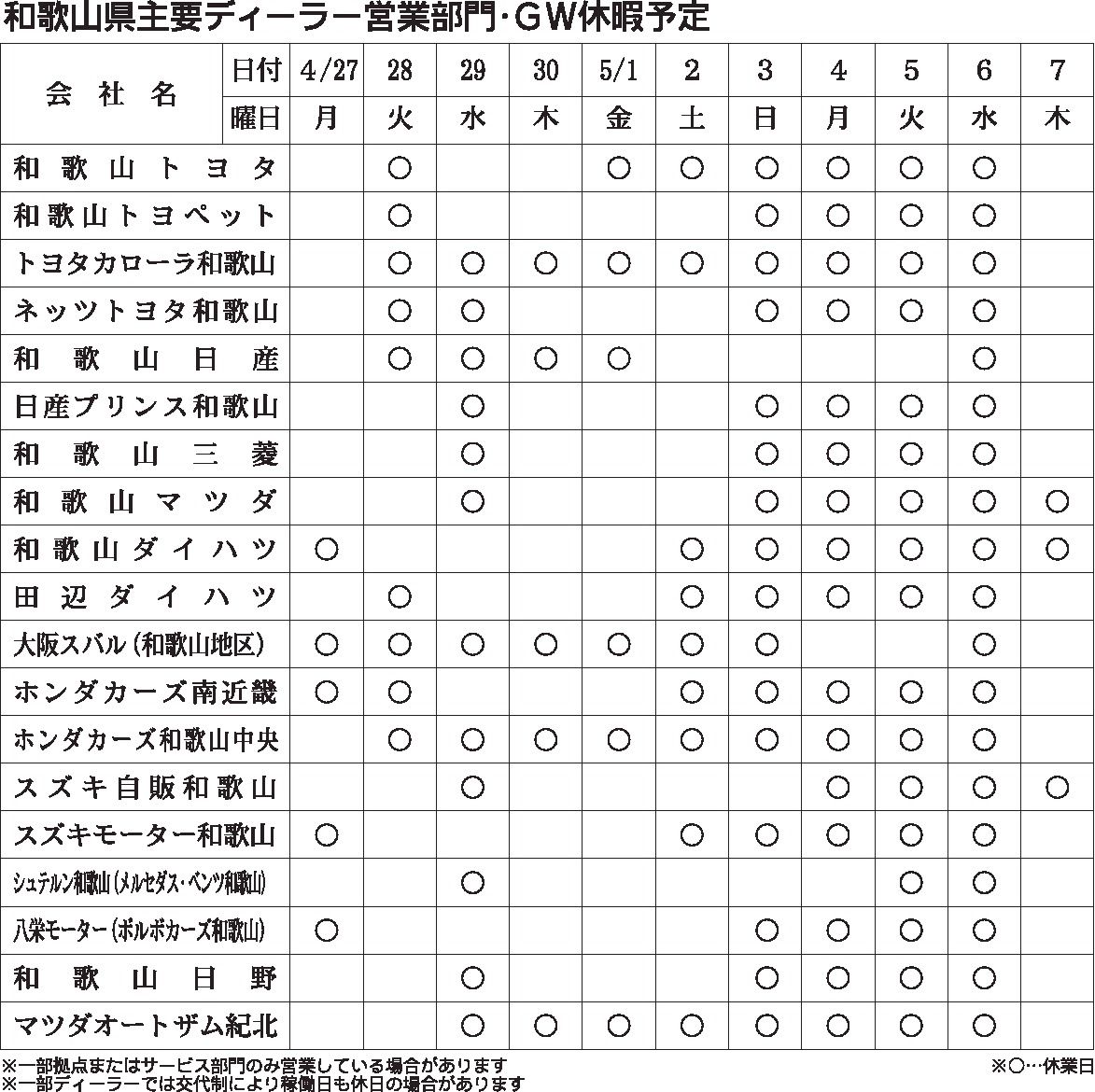〈和歌山県主要ディーラー営業部門・GW休暇予定表〉