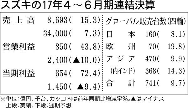 スズキが3日に発表した2018年3月期第1四半期(4~6月)決算は、営業利益が前年同期比43・8%増と大幅に増加し、利益項目で第1四半期として過去最高を更新した。インドの販売好調などにより売上高も2年ぶりのプラスとなり増収増益となった。一...