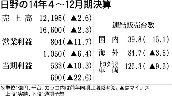 日野自動車が29日発表した2014年4~12月期の連結決算は、海外でのトラック・バスの売り上げが減少したのに加え、トヨタ自動車からの受託生産車も減少し、減収減益となった。通期業績見通しは利益を上方修正した。 日野ブランド車のグローバル販売...