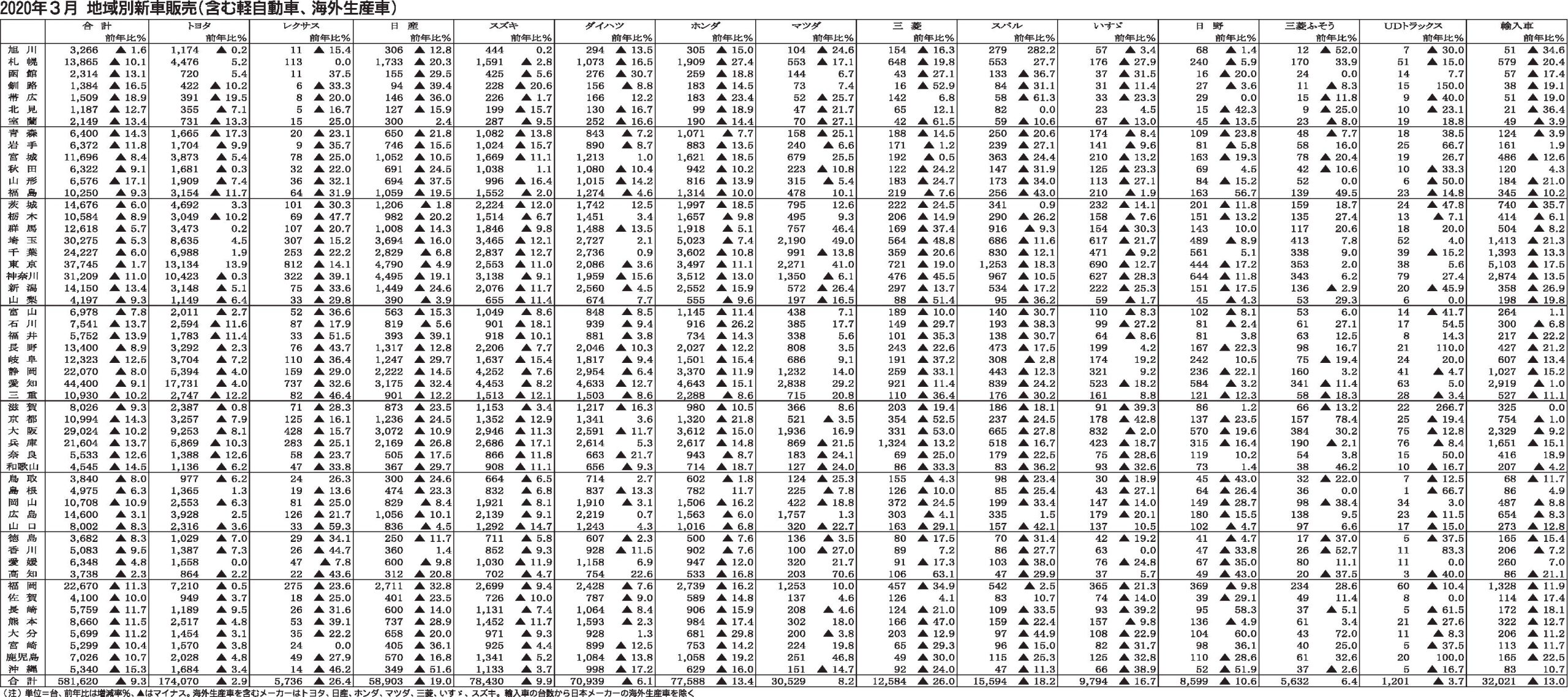 〈2020年3月 地域別新車販売(含む軽自動車、海外生産車)〉